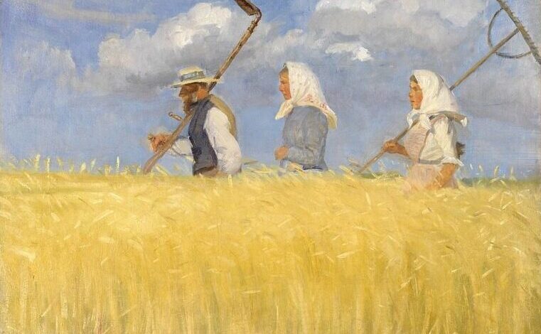 «آنچر» فقط نقاش نور در فضای داخلی نبود. او حومه شهر و اطراف ساحل «اسکاگن» را نیز نقاشی میکرد. نقاشی «دروگران» از تابش خورشید بهره میبرد و با پالتی که عامدانه با رنگهای محدودی یعنی فقط آبی، زرد و سفید، انتخاب شده است و ترکیببندی ساده برای برانگیختن حس تابستان در مزارع نقاشی شده است.